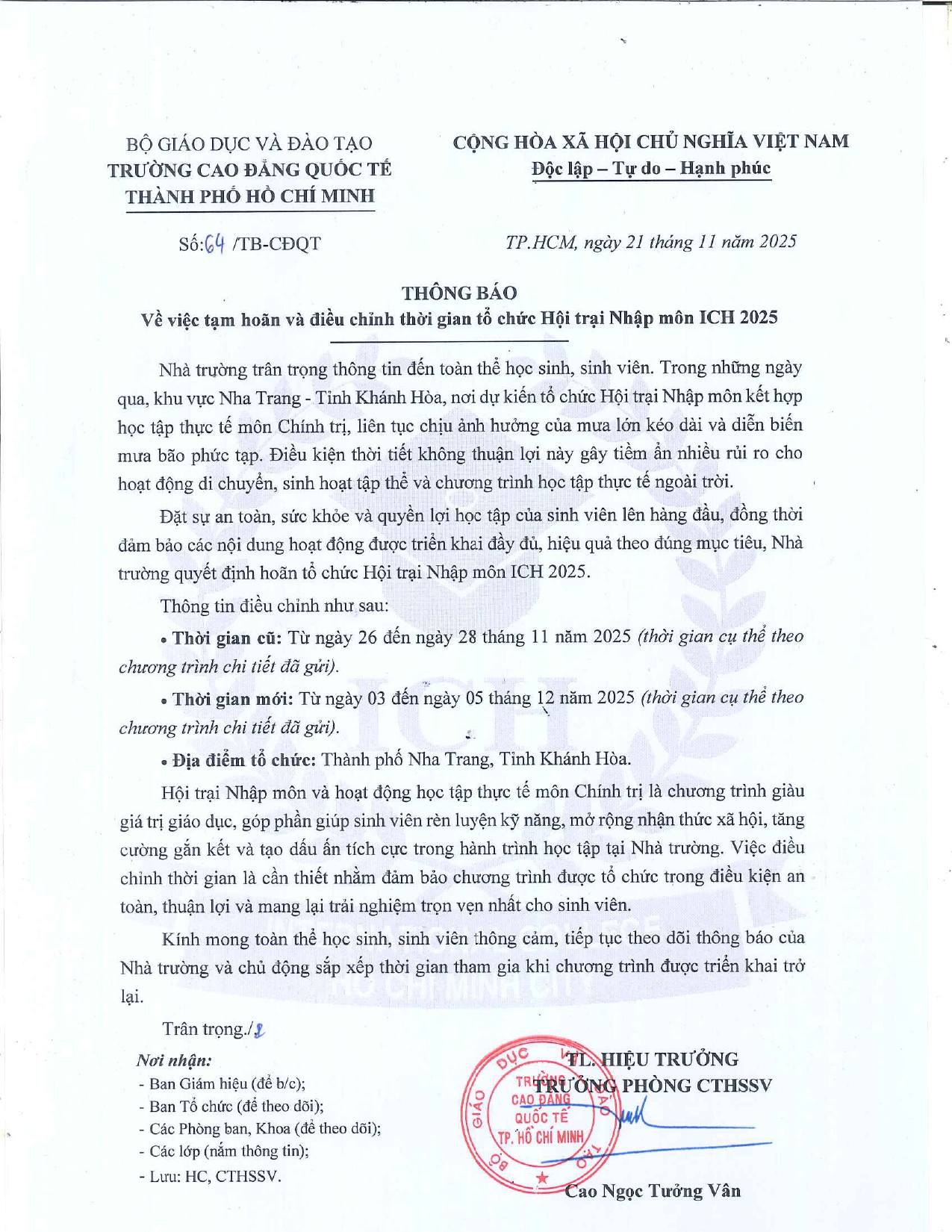 THÔNG BÁO TẠM HOÃN VÀ ĐIỀU CHỈNH THỜI GIAN HỘI TRẠI NHẬP MÔN ICH 2025
